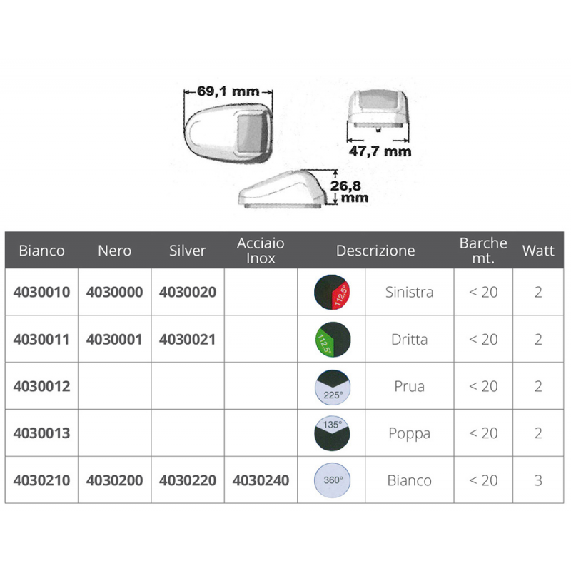 Luminaires de chemin à LED caractérisés par une lumière extrêmement brillante, une clarté des couleurs, des lentilles haute résolution, un design innovant et breveté et une électronique de pointe. Alim. 12-24V, durée de vie env. 10000 heures, correspond à IMO COLREG 1972 nr. ELE453105CS, classe de protection IP56.