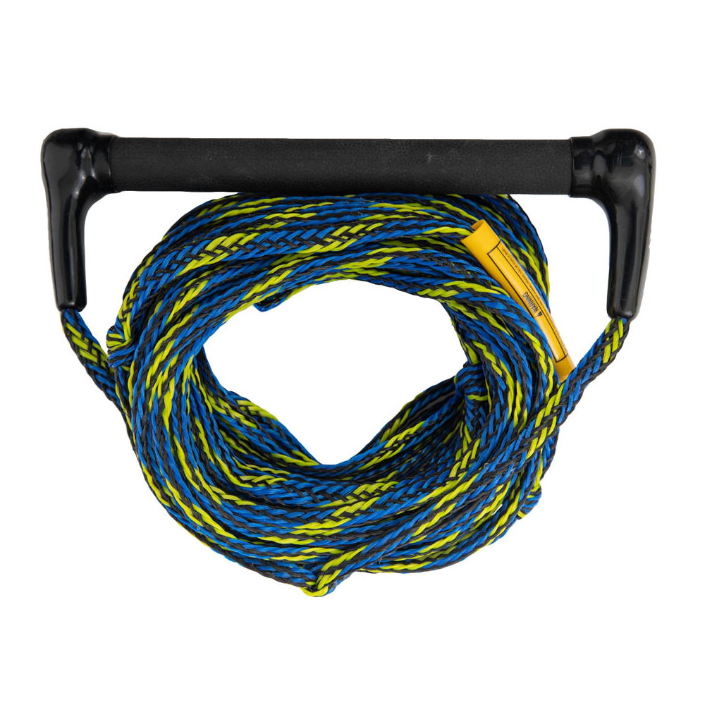 Corde et poignée adaptées à tous les sports nautiques. Poignée arrondie en caoutchouc de cm. 30 de large, avec une épaisseur de dimm. 28. Corde à 12 brins de 18 m de long.