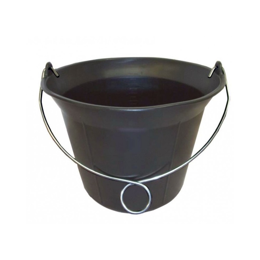 Seau en caoutchouc, composé de plus de 95 % de matériaux recyclés, résistant au gel, à la chaleur et aux chocs, avec graduation en acier galvanisé et poignée avec œillet.