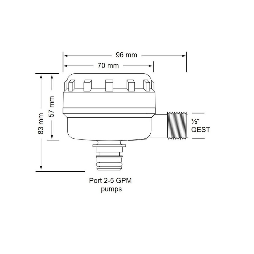 Filtre Pumpgard 90° 40 mesh par pouce carré (ouvertures d'environ 0,4 mm) avec raccord fileté 1/2" et sortie à emboîtement pour pompes Jabsco/Flojet de 2 à 5 GPM. Débit maximal : 23 l/min (6 GPM). Pression maximale : 5 bar (70 PSI). Dimensions : Longueur env. 96 mm / Largeur env. 70 mm / Hauteur env. 83 mm
