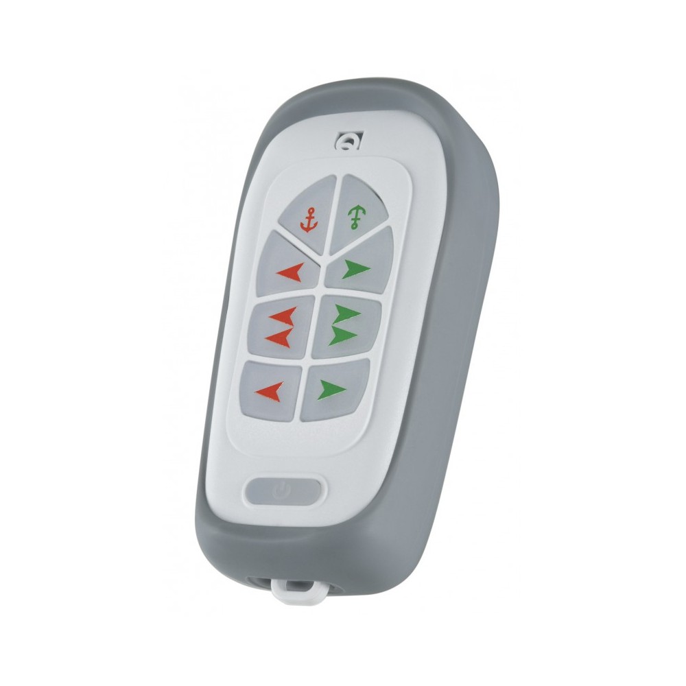 Émetteur portatif avec boîtier en caoutchouc antichoc, indicateur LED, boutons en silicone rétroéclairés et dragonne. Commandes pour l'étrave, la poupe et le guindeau. Récepteur non inclus. Fréquence : 869,8 MHz.